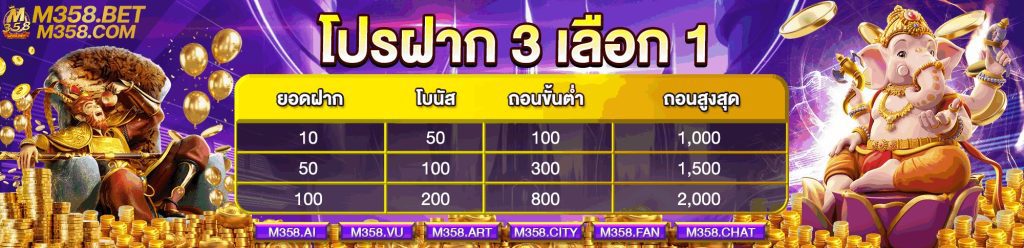 - โปรโมชั่นสุดน่าดึงดูด: M358TH นำเสนอโปรโมชั่นสุดน่าดึงดูดมากมาย เช่น เงินคืน โบนัสการฝากเงิน และของขวัญล้ำค่า มอบประสบการณ์ที่ยอดเยี่ยมและน่าตื่นเต้นให้กับผู้เล่น